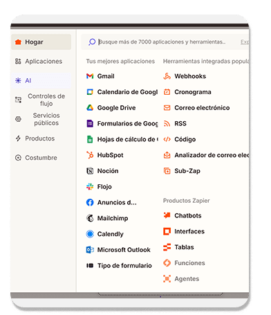 Zapier cuenta con más de 5.000 aplicaciones disponibles.  El método de integración puede variar según la aplicación, por lo que se recomienda revisar su documentación oficial.